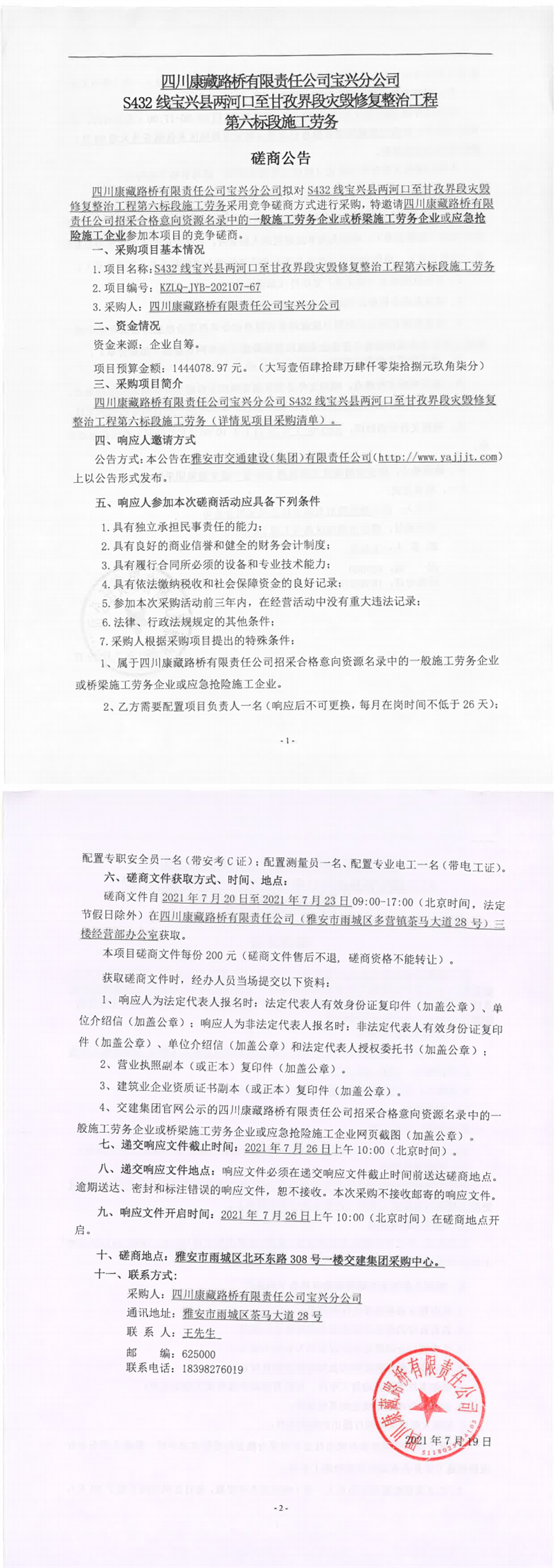 四川康藏路桥有限责任公司宝兴分公司S432线宝兴县两河口至甘孜界段灾毁修复整治工程第六标段施工劳务磋商公告