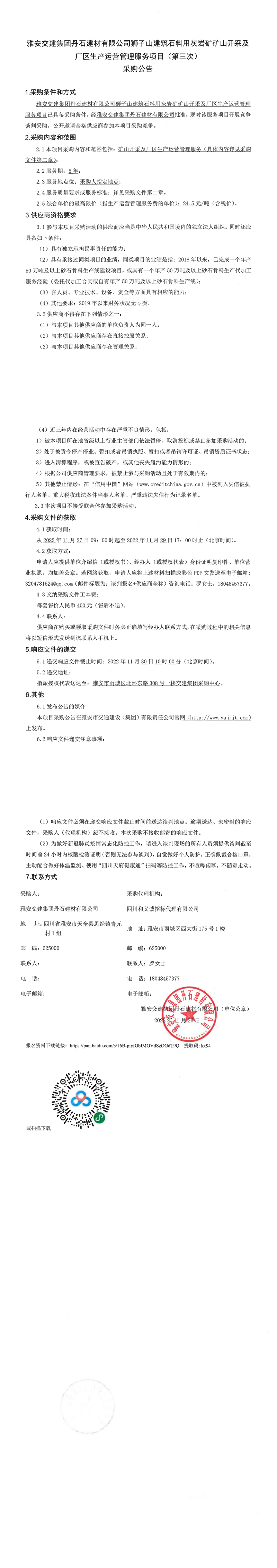 币游集团丹石建材有限公司狮子山建筑石料用灰岩矿矿山开采及厂区生产运营管理服务项目(第三次)采购公告