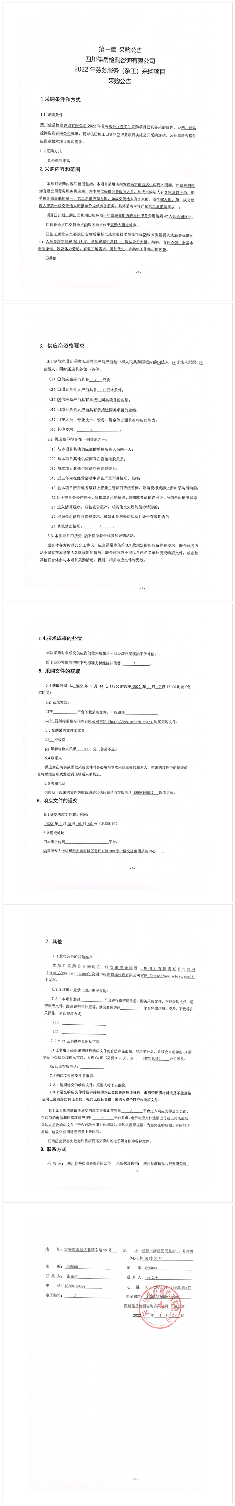 四川佳岳检测咨询有限公司2022年劳务服务(杂工)采购项目采购公告