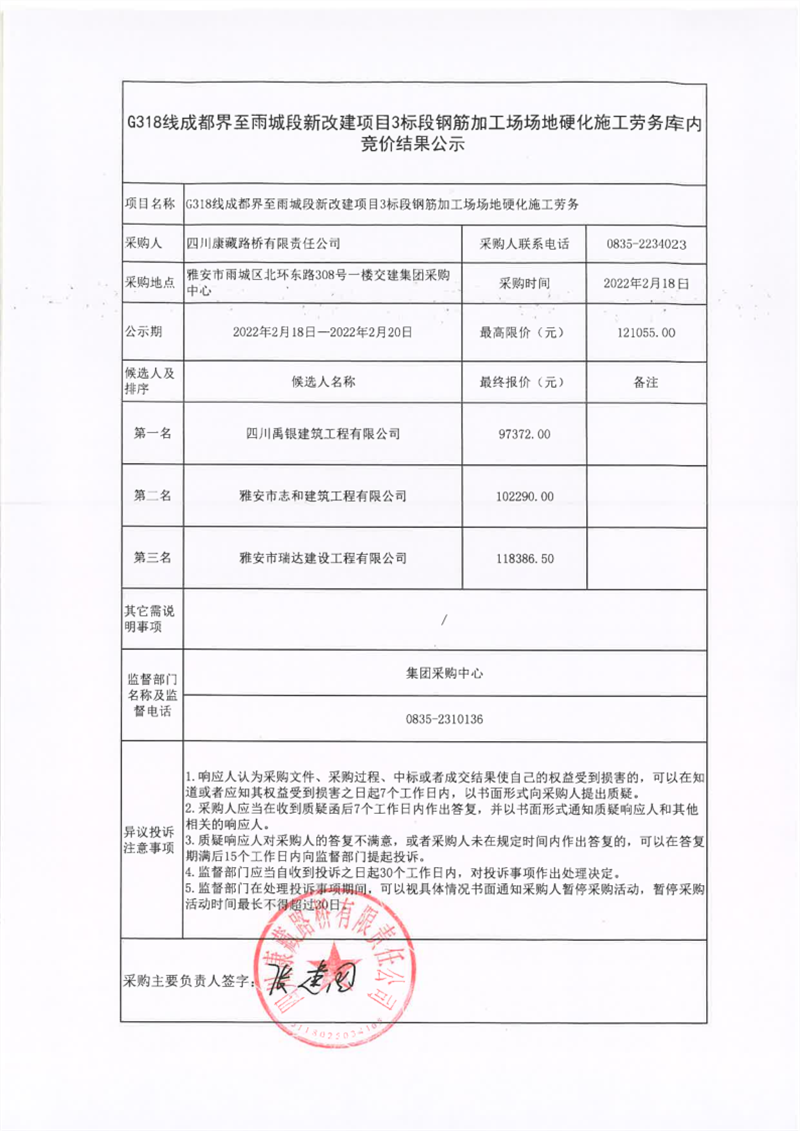 四川康藏路桥有限责任公司G318线成都界至雨城段新改建项目3标段钢筋加工场场地硬化施工劳务库内竞价结果公示