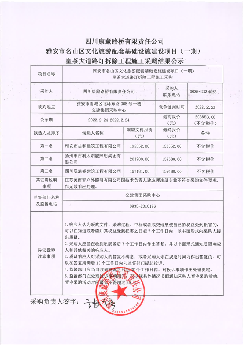 四川康藏路桥有限责任公司雅安市名山区文化旅游配套基础设施建设项目(一期)皇茶大道路灯拆除工程施工采购结果公示