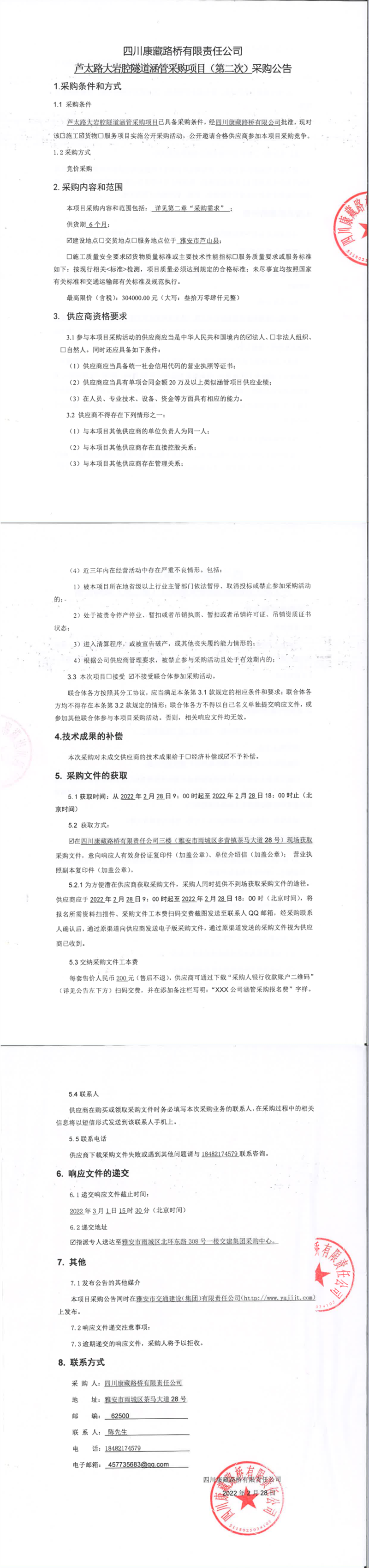 四川康藏路桥有限责任公司芦太路大岩腔隧道涵管采购项目(第二次)采购公告