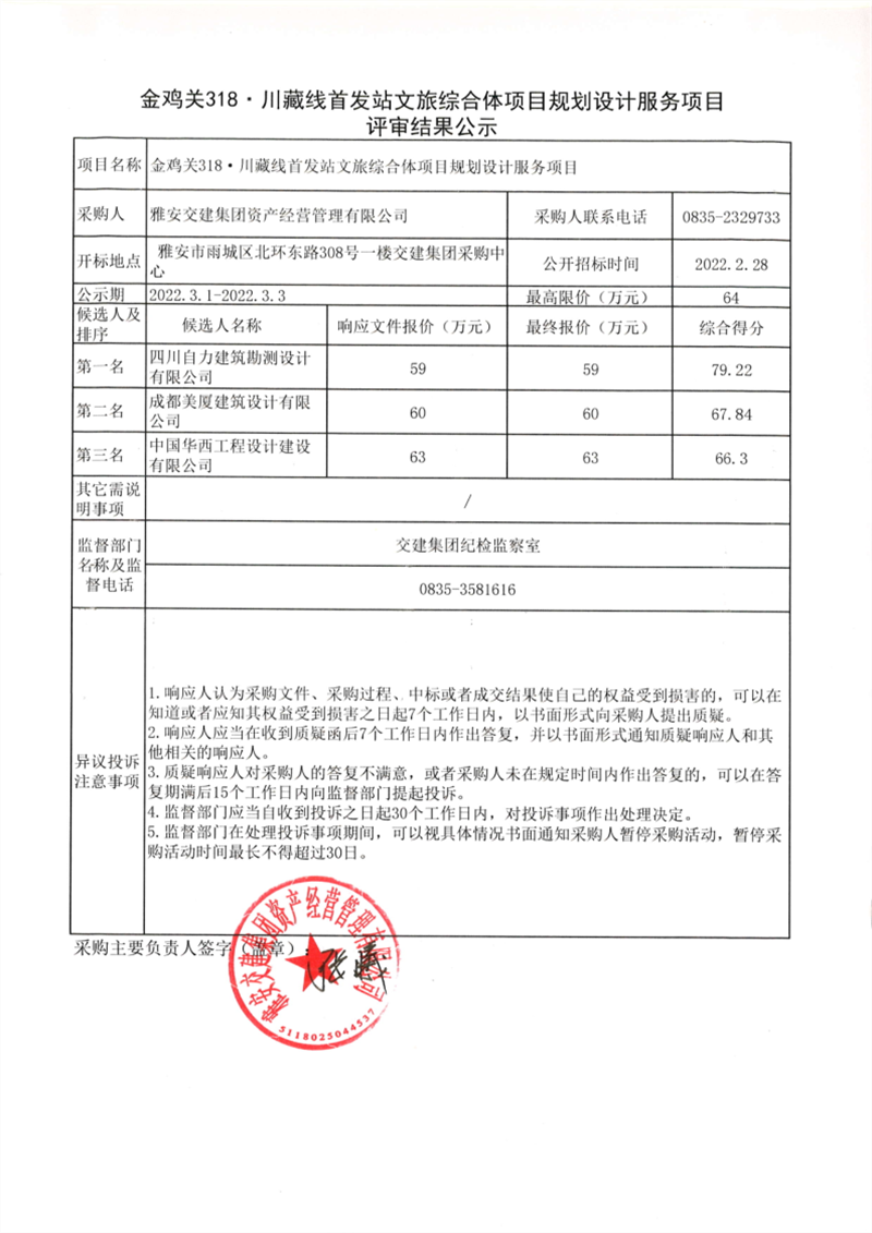 币游集团资产经营管理有限公司金鸡关318.川藏线首发站文旅综合体项目规划设计服务项目评审结果公示