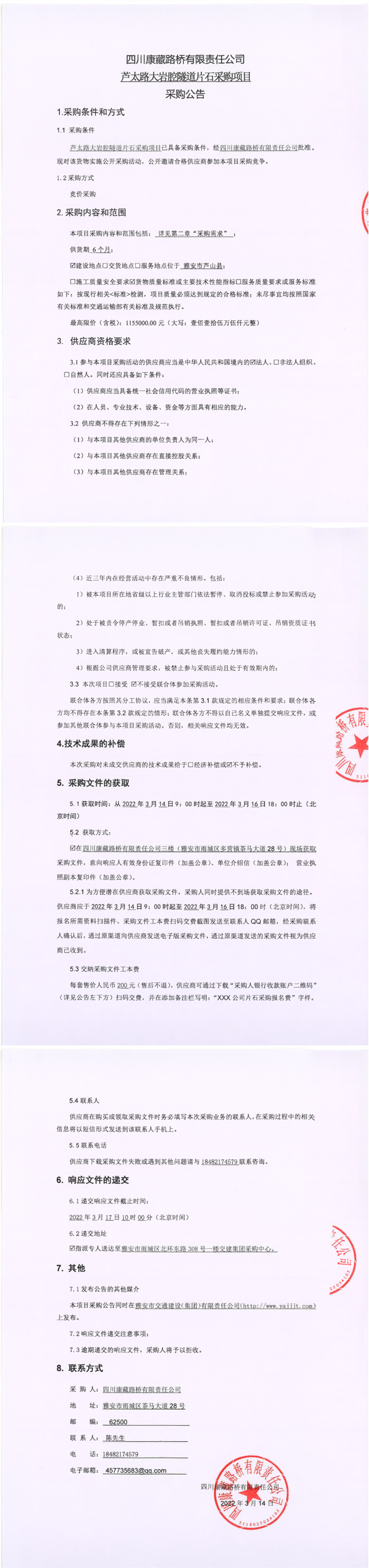 四川康藏路桥有限责任公司芦太路大岩腔隧道建渣采购项目采购公告