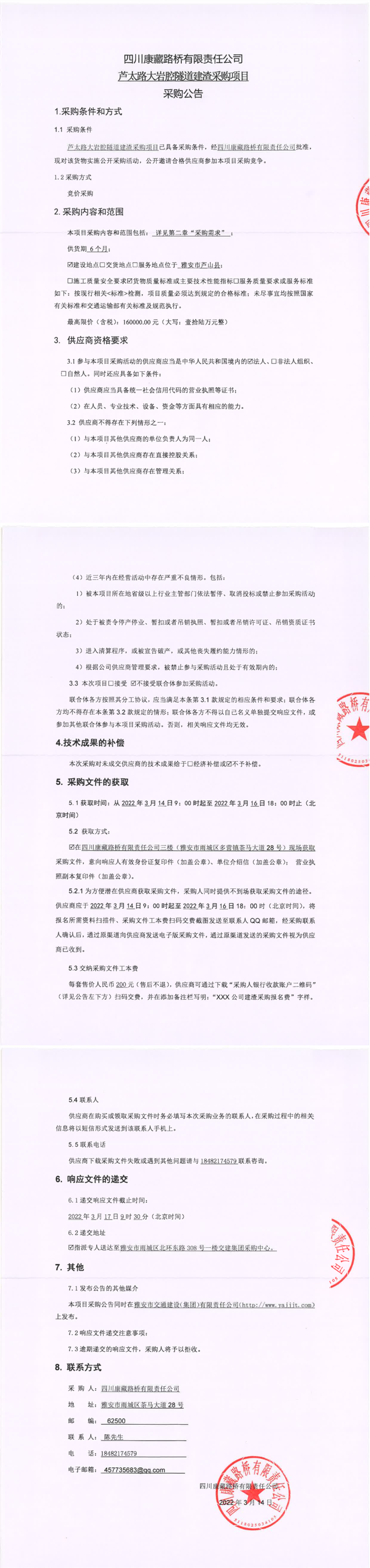 四川康藏路桥有限责任公司芦太路大岩腔隧道建渣采购项目采购公告