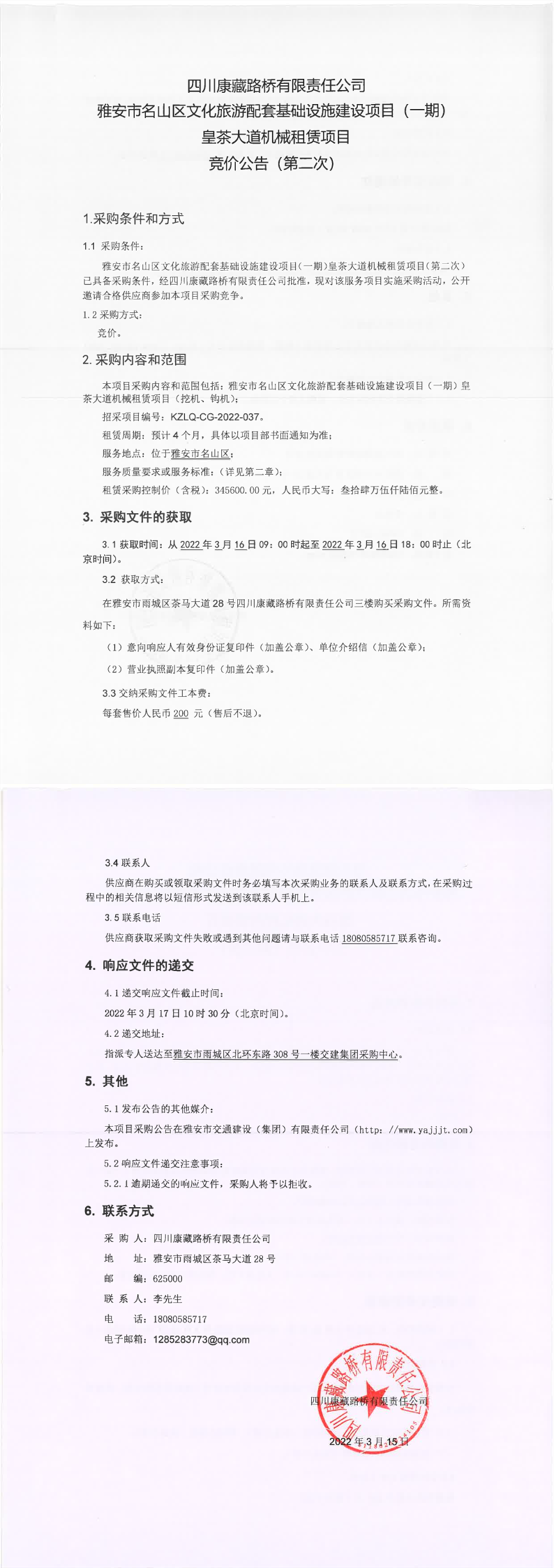四川康藏路桥有限责任公司雅安市名山区文化旅游配套基础设施建设项目(一期)皇茶大道机械租赁项目竞价公告(第二次)