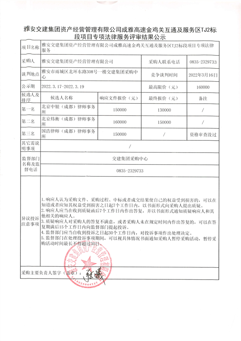 币游集团资产经营管理有限公司成雅高速金鸡关互通及服务区TJ2标段项目专项法律服务评审结果公示