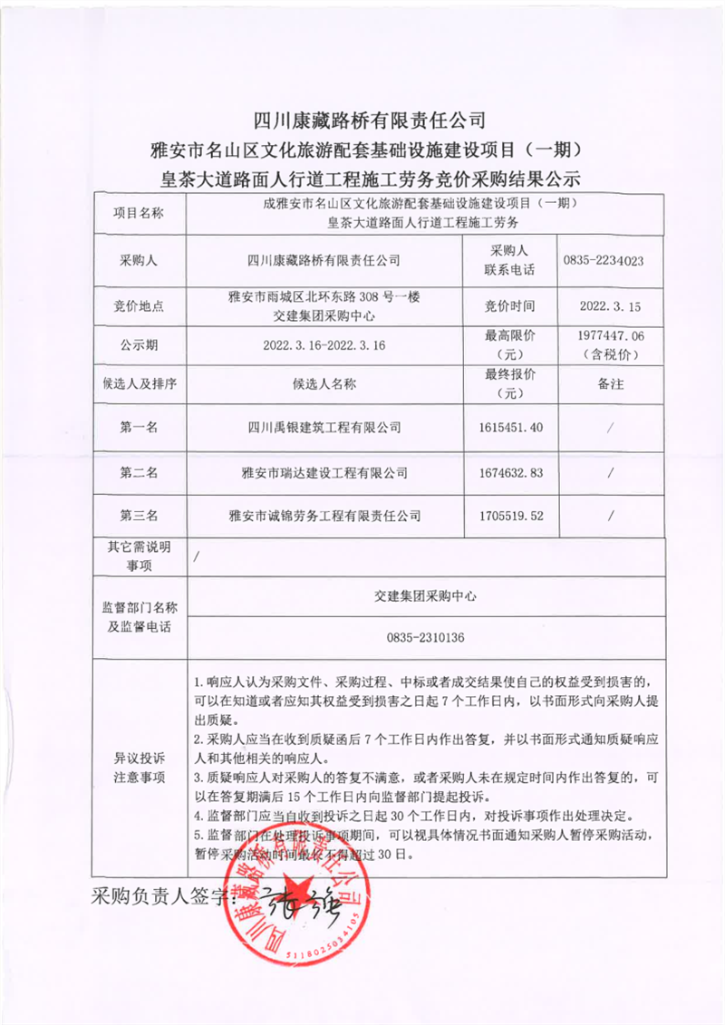 四川康藏路桥有限责任公司雅安市名山区文化旅游配套基础设施建设项目(一期)皇茶大道路面人行道工程施工劳务竞价采购结果公示