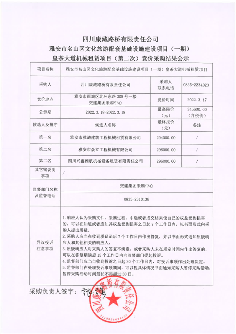 四川康藏路桥有限责任公司雅安市名山区文化旅游配套基础设施建设项目(一期)皇茶大道机械租赁项目(第二次)竞价采购结果公示
