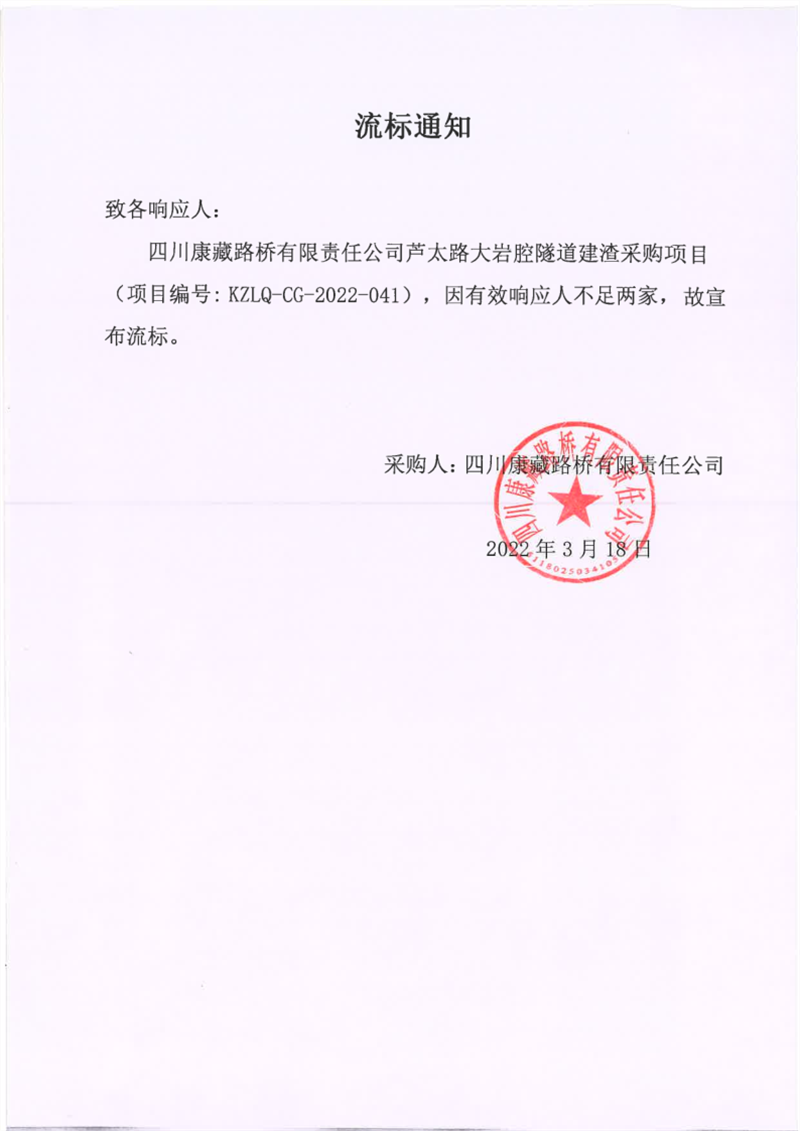 四川康藏路桥有限责任公司芦太路大岩腔隧道建渣采购项目流标通知