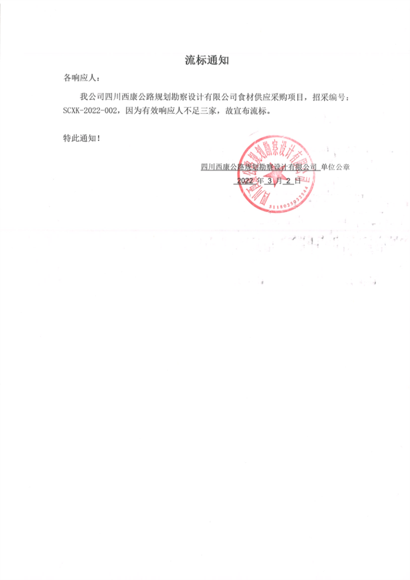 四川西康公路规划勘察设计有限公司食材供应采购项目流标通知
