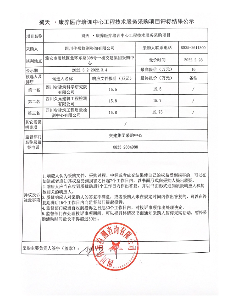 四川佳岳检测咨询有限公司蜀天.康养医疗培训中心工程技术服务采购项目评标结果公示
