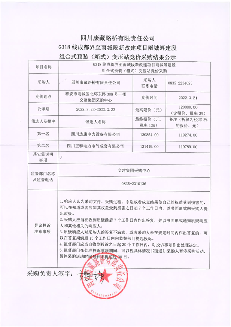 四川康藏路桥有限责任公司G318线成都界至雨城段新改建项目雨城筹建段组合式预装(箱式)变压站竞价采购结果公示