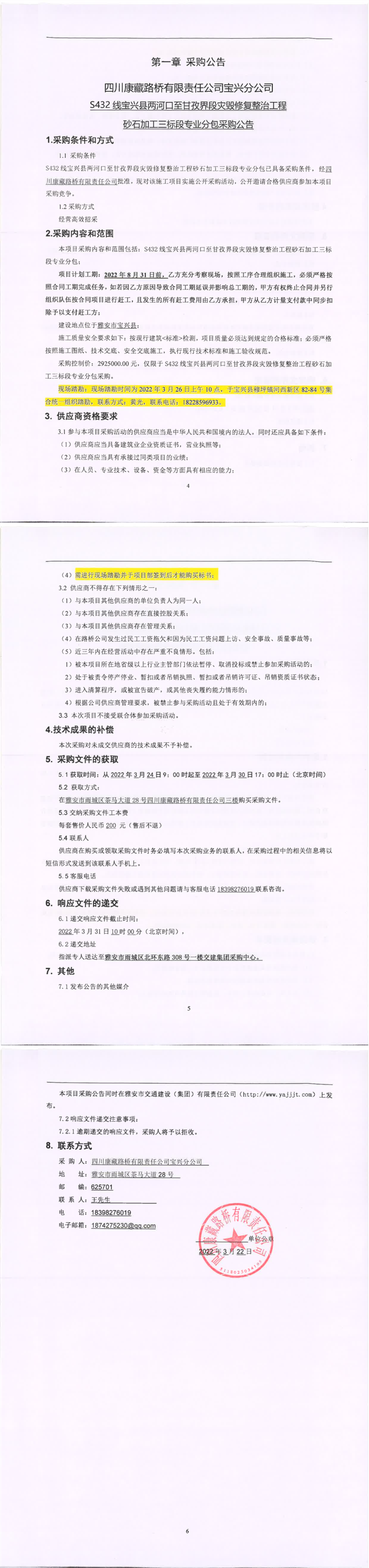 四川康藏路桥有限责任公司S432线宝兴县两河口至甘孜界段灾毁修复整治工程2022年路面工程一标专业分包采购公告