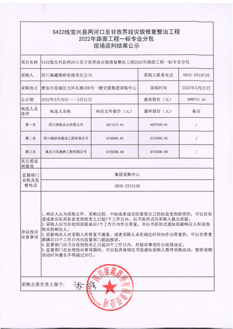 四川康藏路桥有限责任公司S432线宝兴县两河口至甘孜界段灾毁修复整治工程2022年路面工程一标专业分包现场谈判结果公示