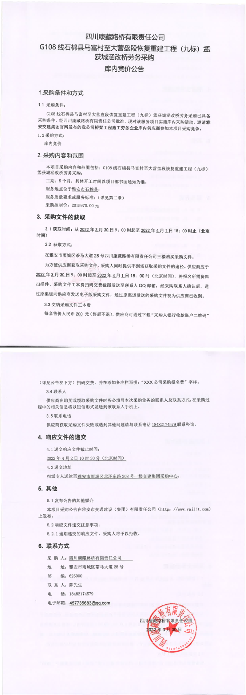 四川康藏路桥有限责任公司G108线石棉县马富村至大营盘段恢复重建工程(九标)孟获城涵改桥劳务采购库内竞价公告