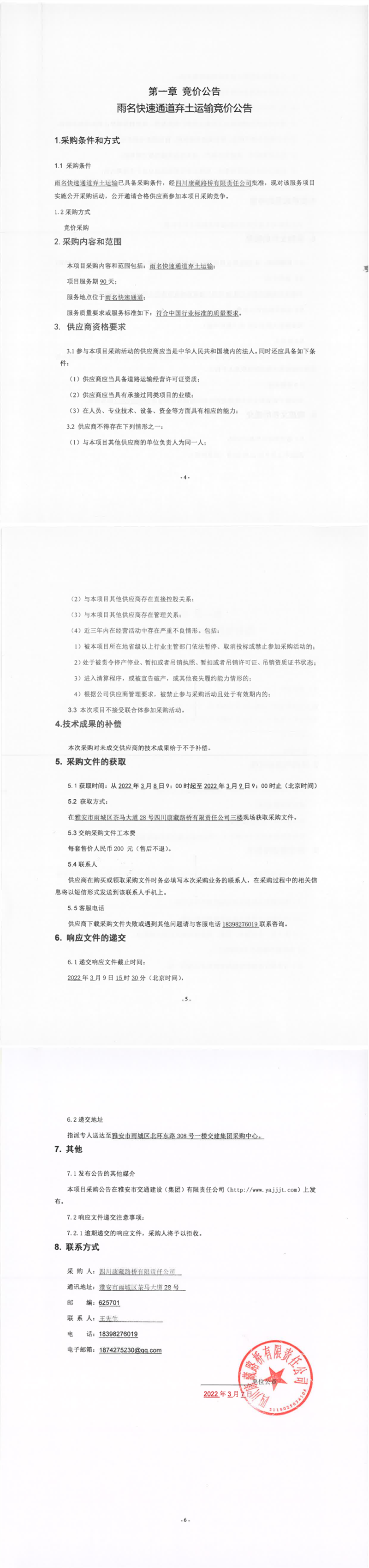 四川康藏路桥有限责任公司雨名快速通道弃土运输竞价公告