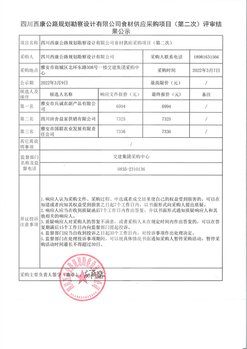 四川西康公路规划勘察设计有限公司食材供应采购项目(第二次)评审结果公示