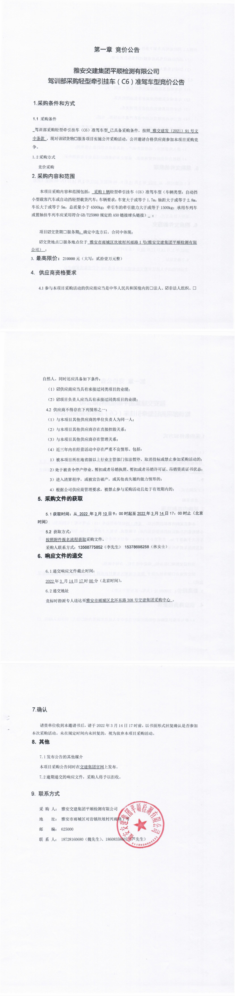 币游集团平顺检测有限公司驾训部采购轻型牵引挂车(C6)准驾车型竞价公告
