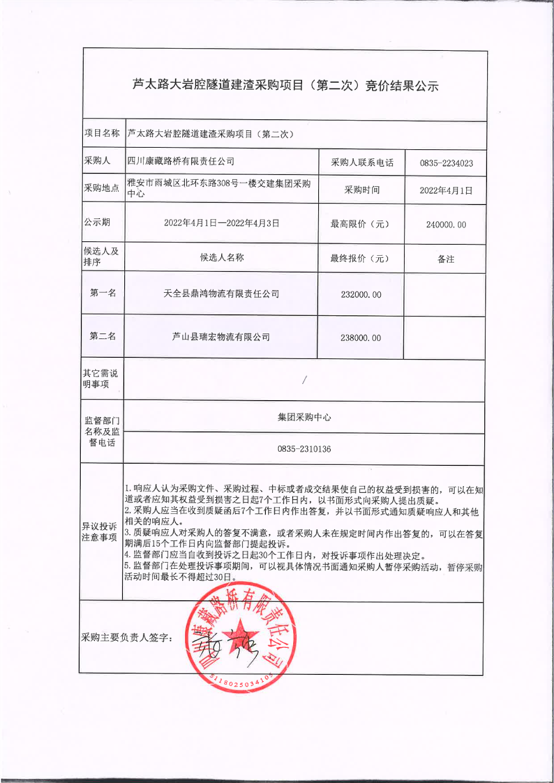 四川康藏路桥有限责任公司芦太路大岩腔隧道建渣采购项目(第二次)竞价结果公示