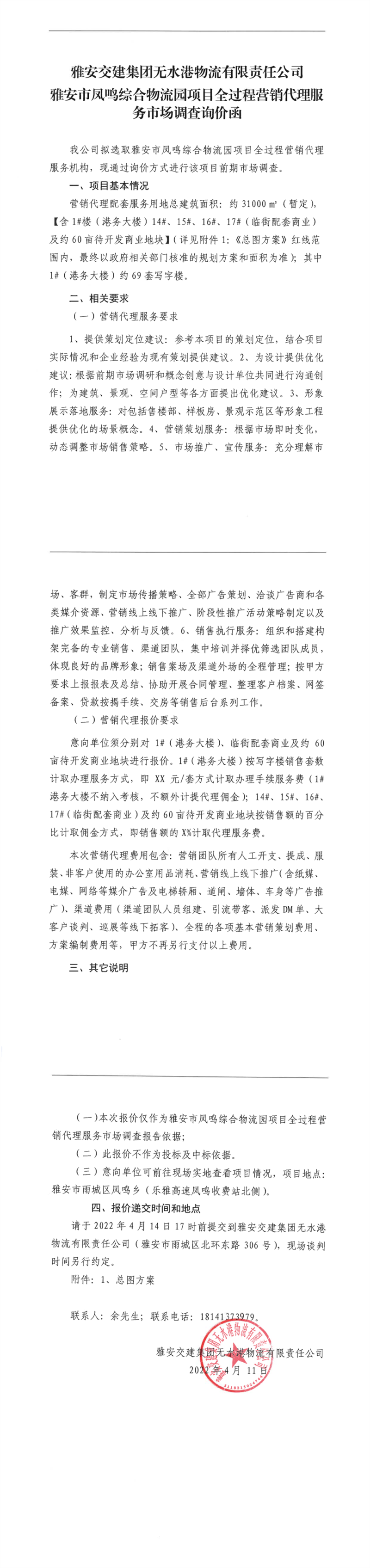 币游集团无水港物流有限责任公司雅安市凤鸣综合物流园项目全过程营销代理服务市场调查询价函