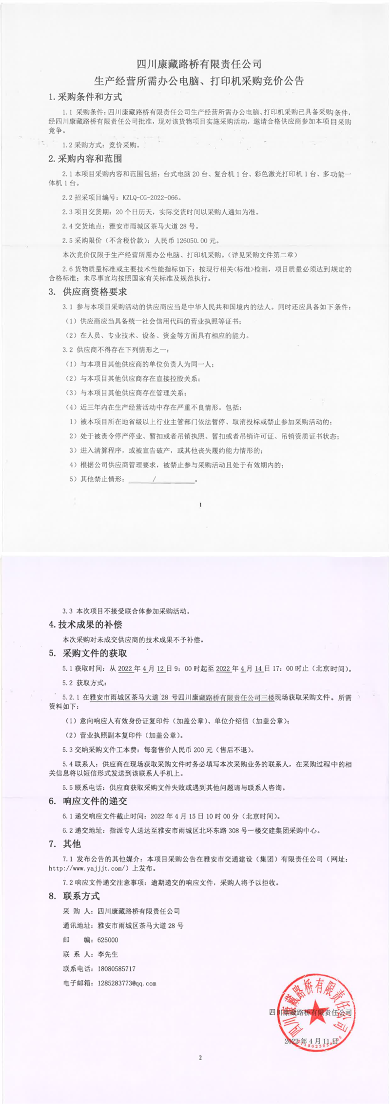 四川康藏路桥有限责任公司生产经营所需办公电脑、打印机采购竞价公告