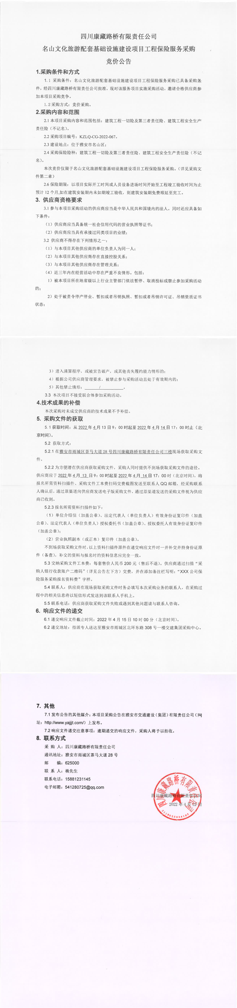 四川康藏路桥有限责任公司名山文化旅游配套基础设施建设项目工程保险服务采购竞价公告