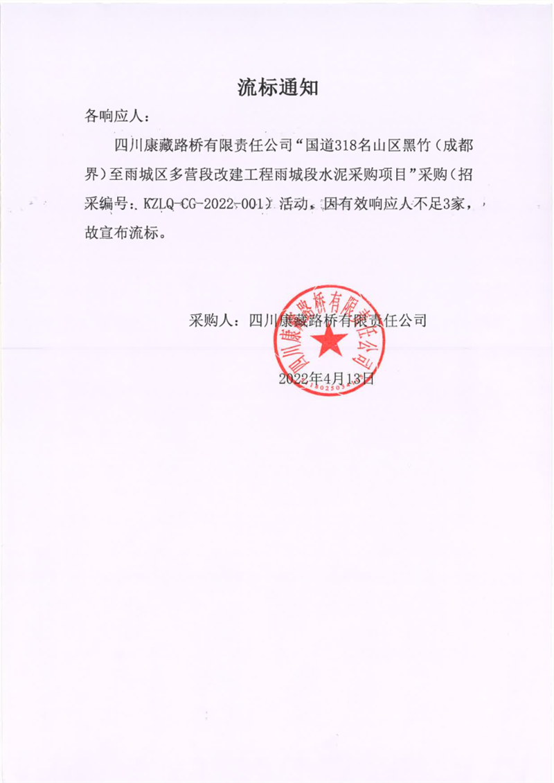 四川康藏路桥有限责任公司国道318名山区黑竹(成都界)至雨城区多营段改建工程雨城段水泥采购项目流标通知