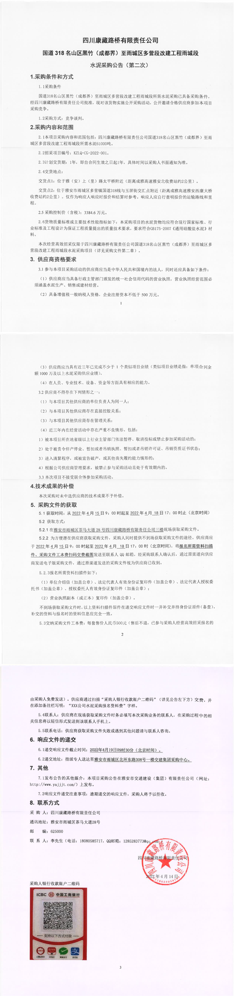 四川康藏路桥有限责任公司国道318名山区黑竹(成都界)至雨城区多营段改建工程雨城段水泥采购公告(第二次)