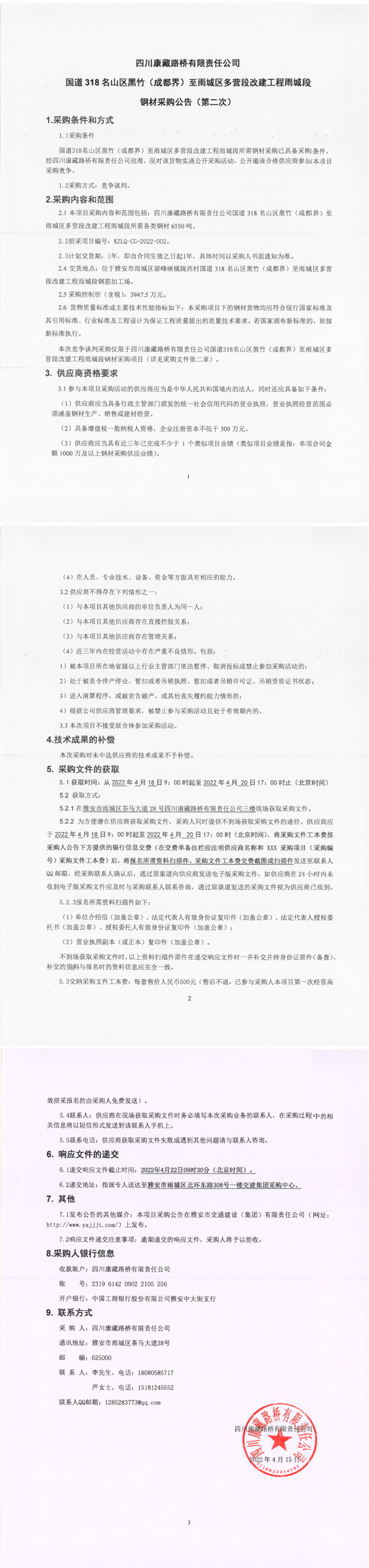 四川康藏路桥有限责任公司国道318名山区黑竹(成都界)至雨城区多营段改建工程雨城段钢材采购公告(第二次)