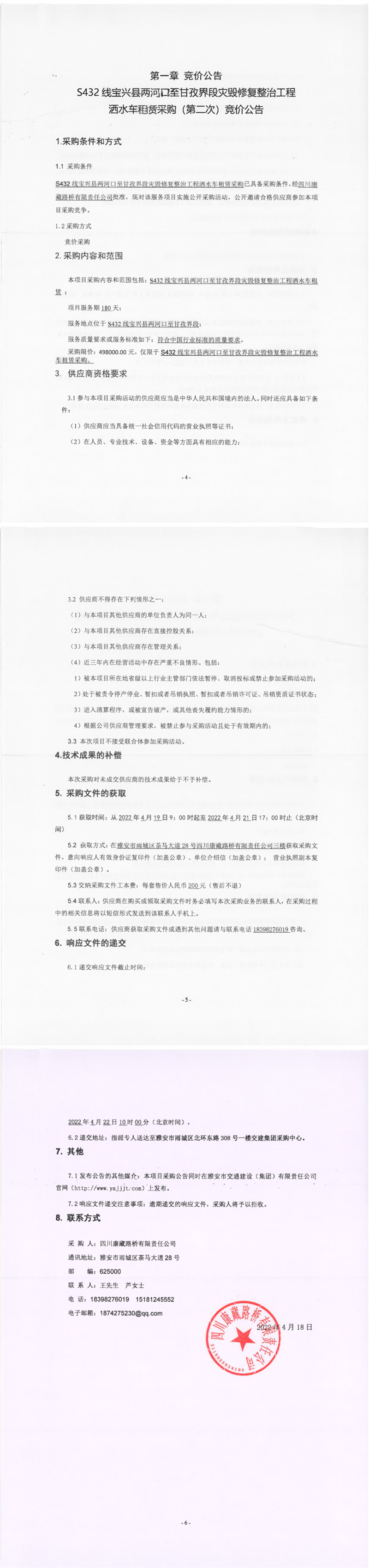 四川康藏路桥有限责任公司S432线宝兴县两河口至甘孜界段灾毁修复整治工程洒水车租赁采购(第二次)竞价公告