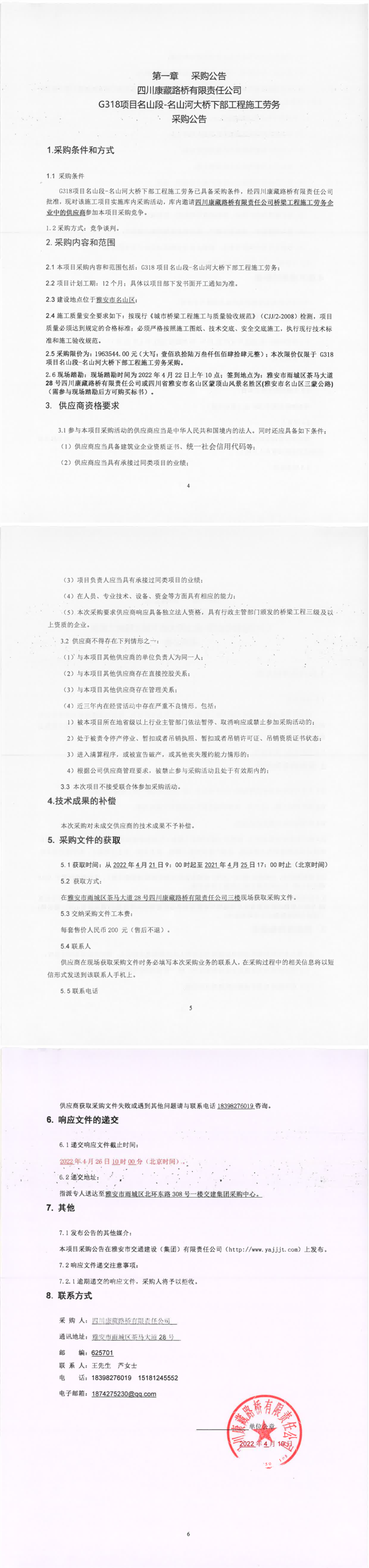 四川康藏路桥有限责任公司G318项目名山段-名山河大桥下部工程施工劳务采购公告