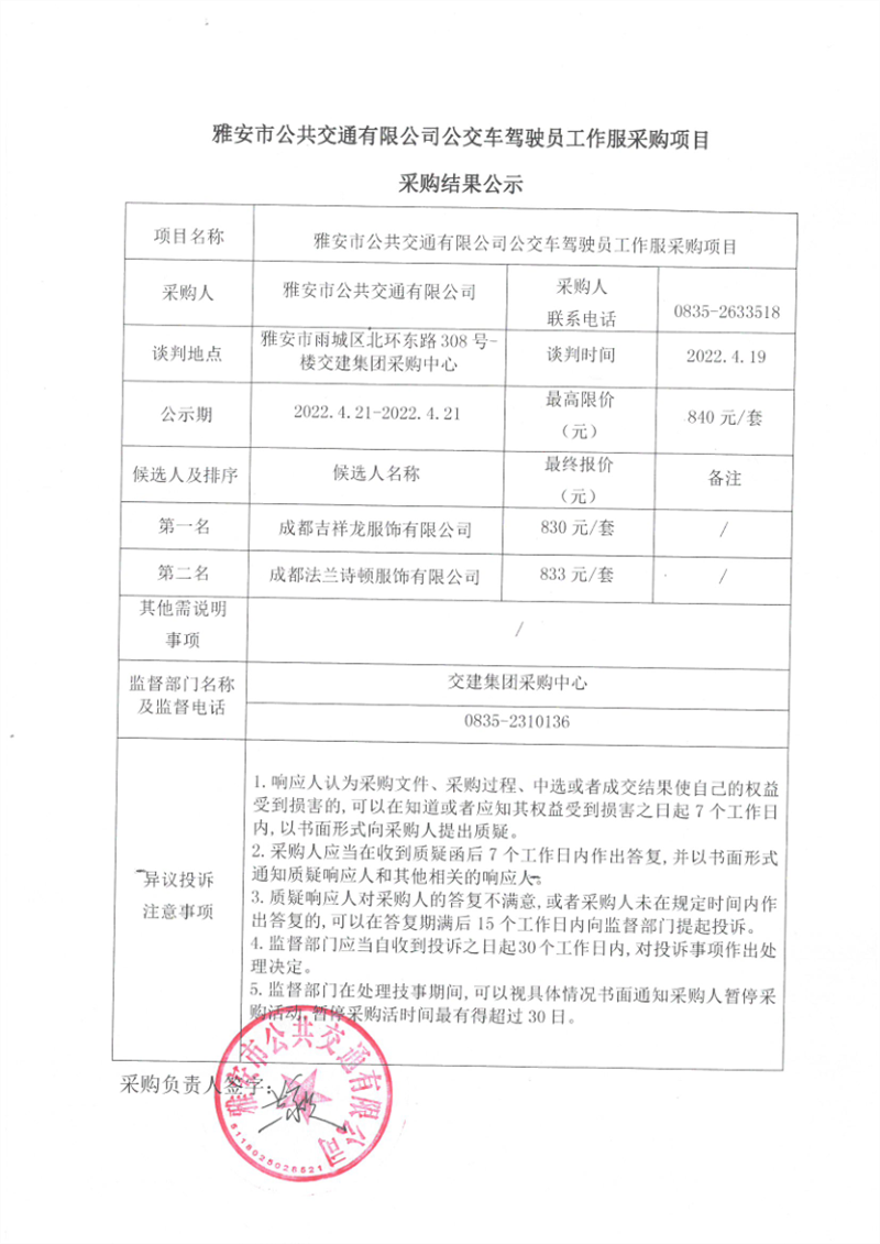 雅安市公共交通有限公司公交车驾驶员工作服采购项目采购结果公示