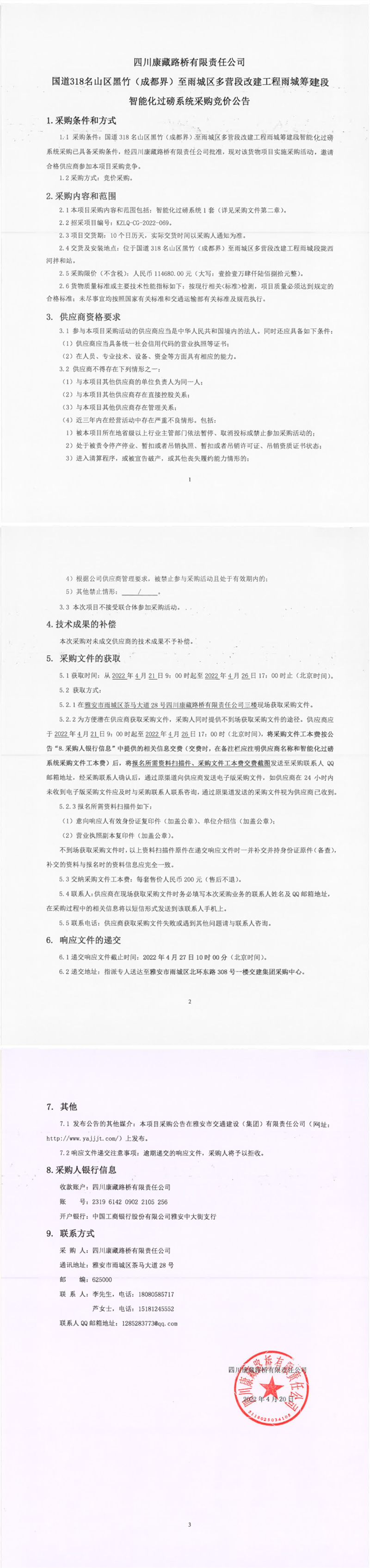 四川康藏路桥有限责任公司国道318名山区黑竹(成都界)至雨城区多营段改建工程雨城筹建段智能化过磅系统采购竞价公告