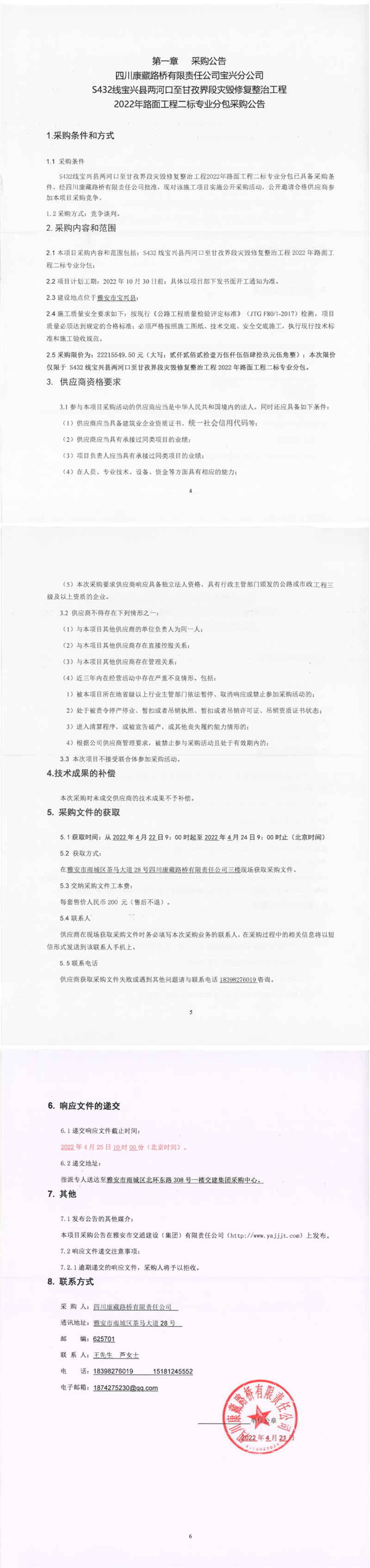 四川康藏路桥有限责任公司S432线宝兴县两河口至甘孜界段灾毁修复整治工程2022年路面工程二标专业分包采购公告