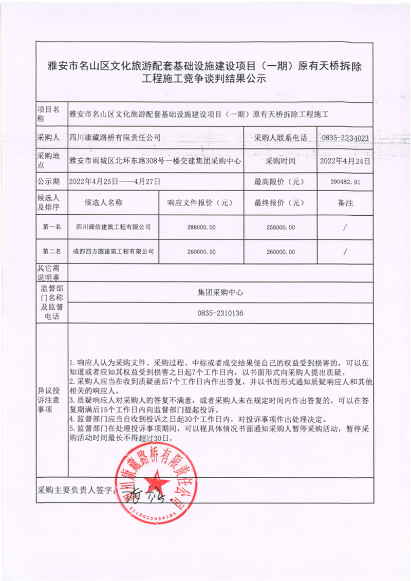 四川康藏路桥有限责任公司雅安市名山区文化旅游配套基础设施建设项目(一期)原有天桥拆除工程施工竞争谈判结果公示