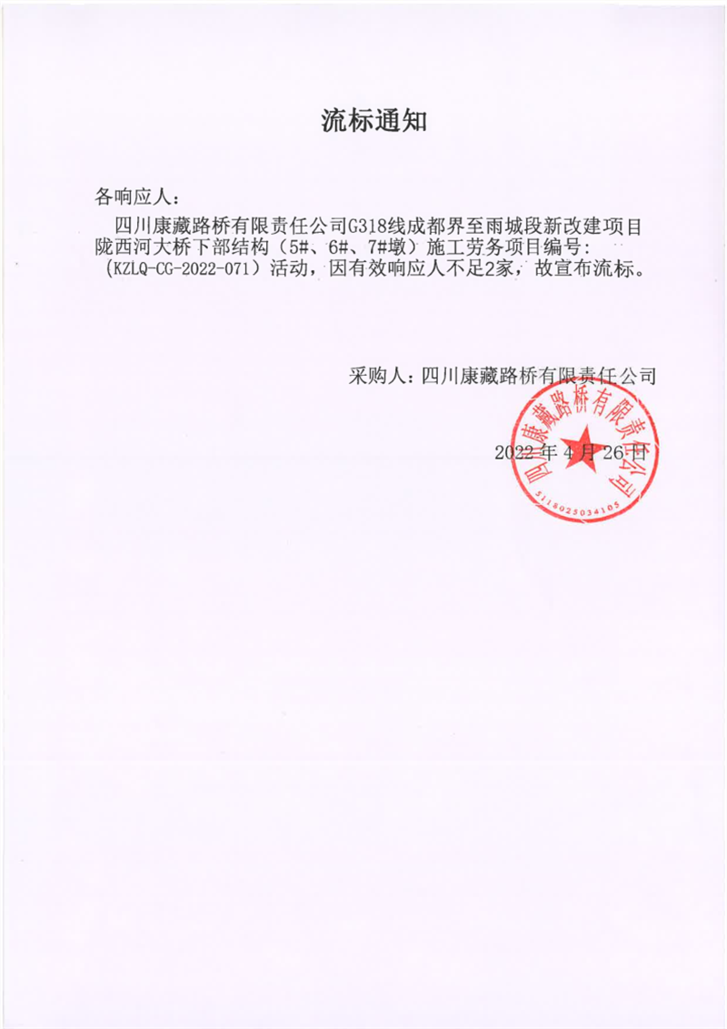 四川康藏路桥有限责任公司G318线成都界至雨城段新改建项目陇西河大桥下部结构(5#、6#、7#墩)施工劳务采购流标通知