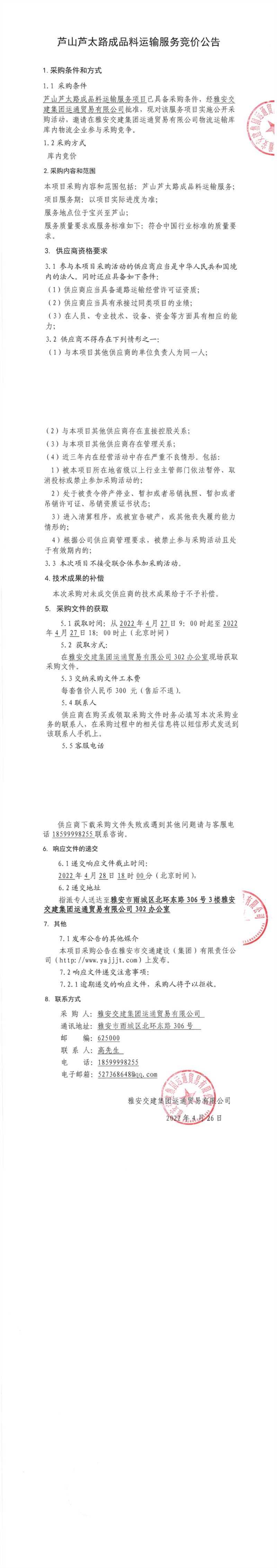 币游集团运通贸易有限公司芦山芦太路成品料运输服务竞价公告
