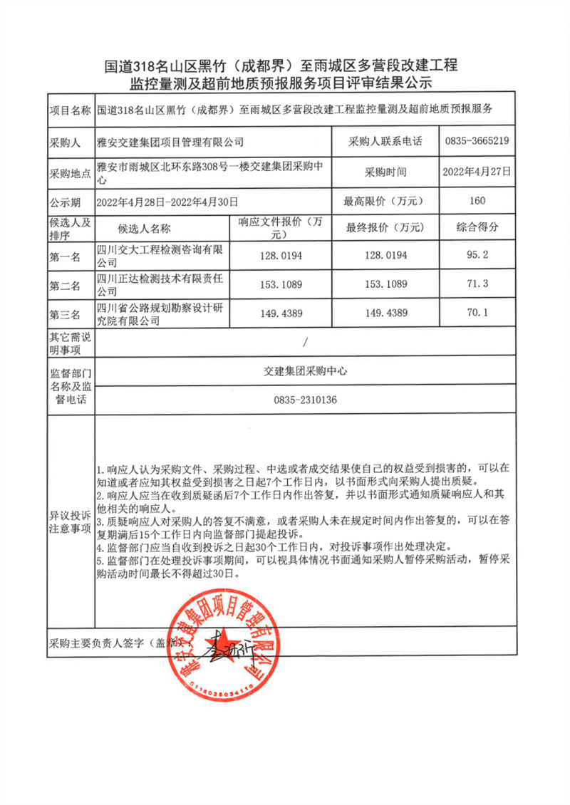 币游集团项目管理有限公司国道318名山区黑竹(成都界)至雨城区多营段改建工程监控量测及超前地质预报服务项目评审结果公示
