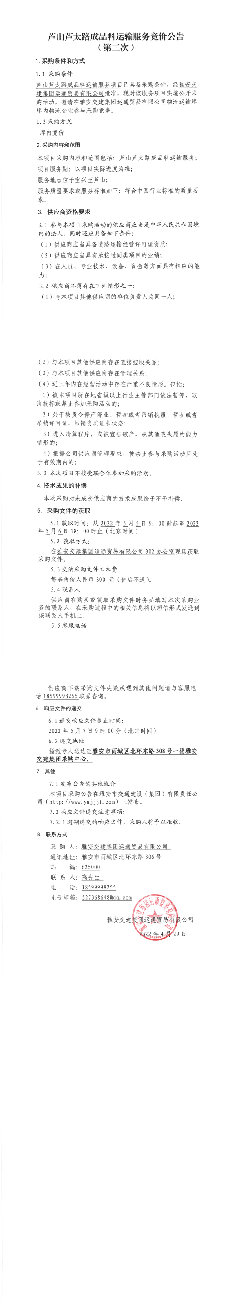 币游集团运通贸易有限公司芦山芦太路成品料运输服务竞价公告(第二次)