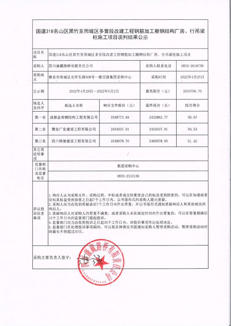 四川康藏路桥有限责任公司国道318名山区黑竹至雨城区多营段改建工程钢筋加工棚钢结构厂房、行吊梁柱施工项目谈判结果公示