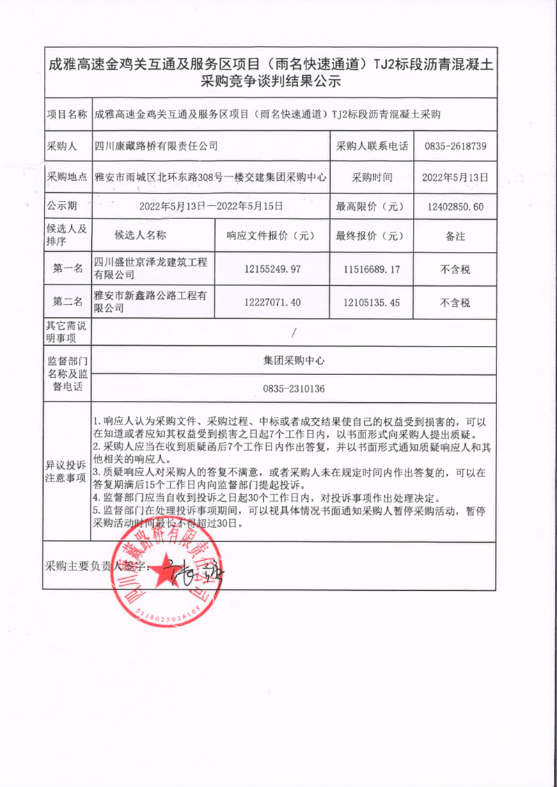 四川康藏路桥有限责任公司成雅高速金鸡关互通及服务区项目(雨名快速通道)TJ2标段沥青混凝土采购竞争谈判结果公示