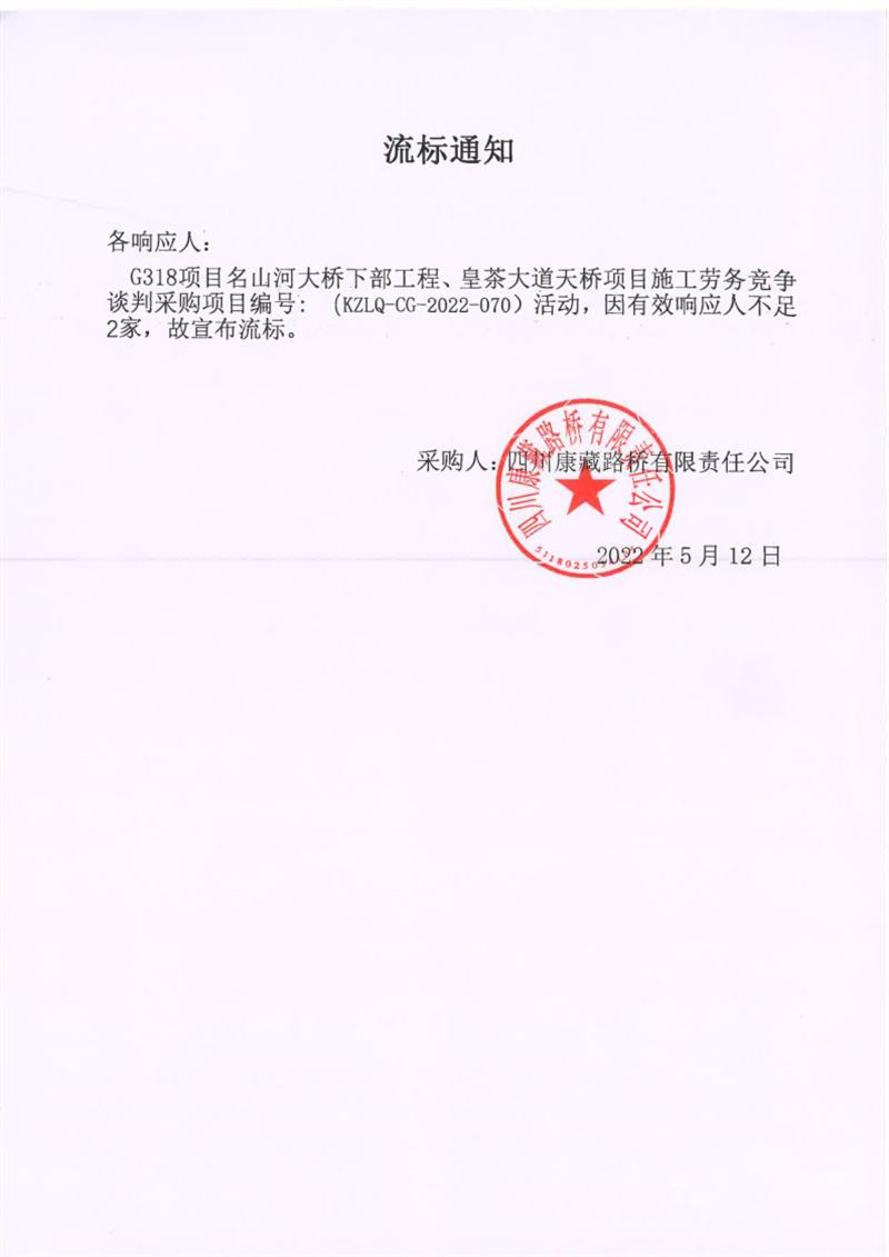 四川康藏路桥有限责任公司G318项目名山河大桥下部工程、皇茶大道天桥项目施工劳务谈判采购项目流标通知