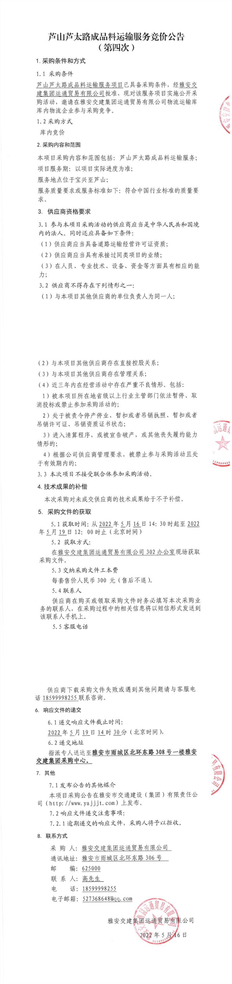 币游集团运通贸易有限公司芦山芦太路成品料运输服务竞价公告(第四次)