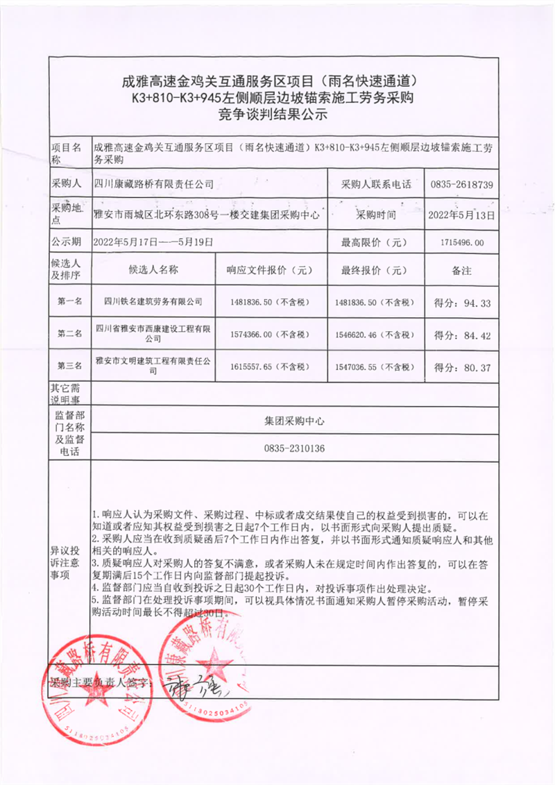 四川康藏路桥有限责任公司成雅高速金鸡关互通服务区项目(雨名快速通道)K3+810-K3+945左侧顺层边坡锚索施工劳务采购竞争谈判结果公示