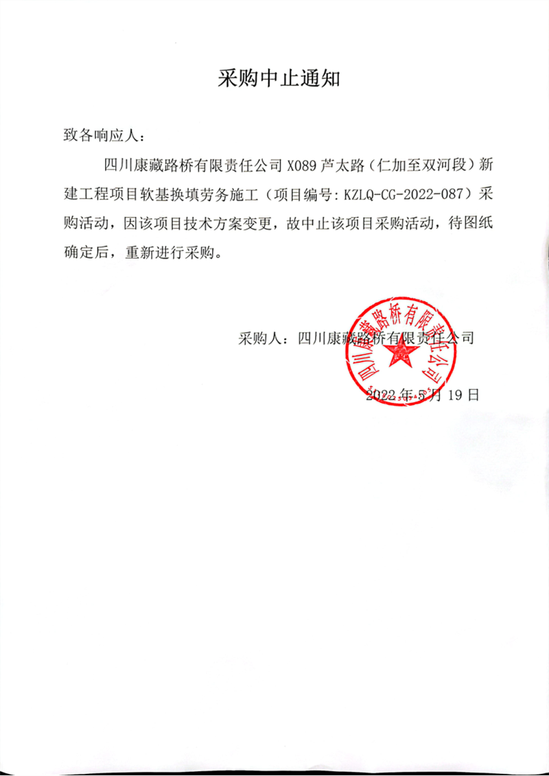 四川康藏路桥有限责任公司X089芦太路(仁加至双河段)新建工程项目软基换填劳务施工采购中止通知