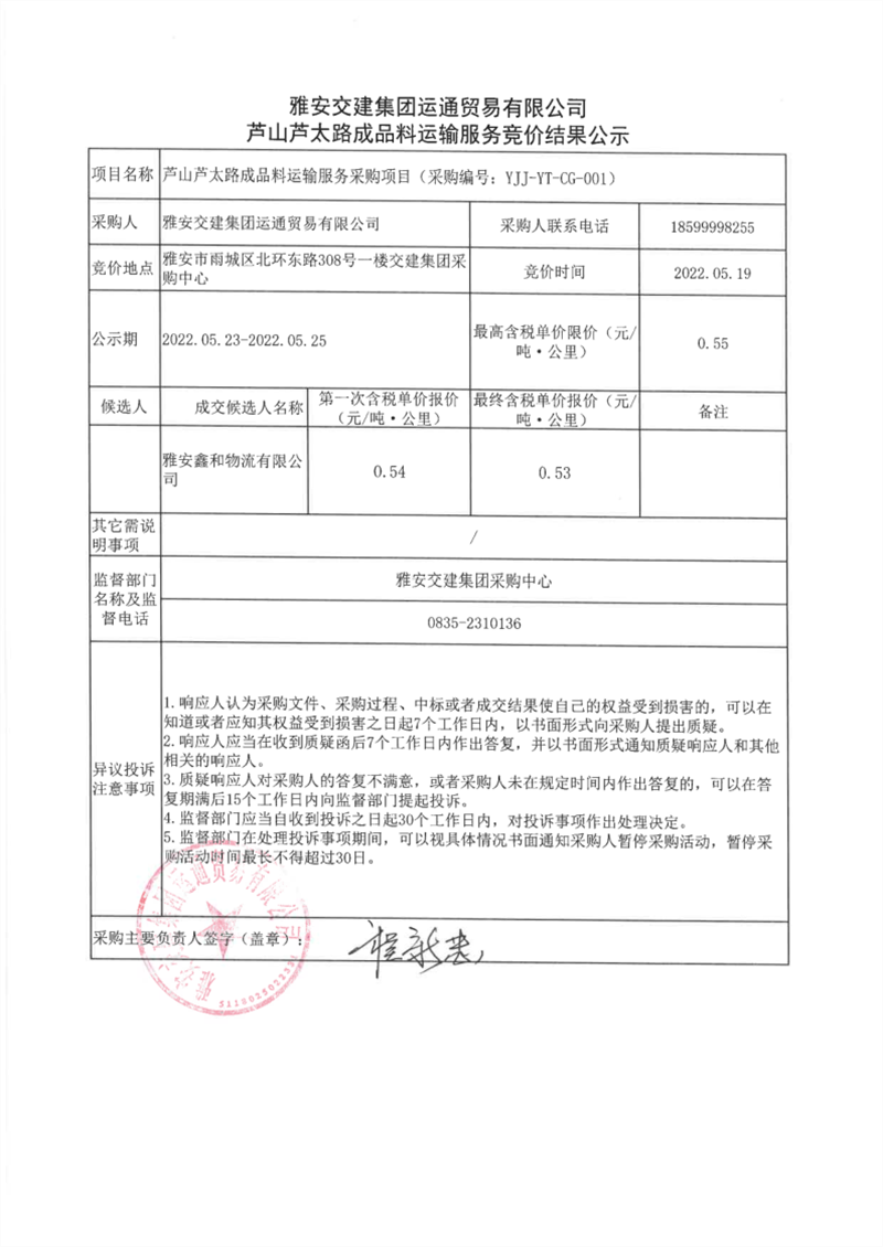 币游集团运通贸易有限公司芦山芦太路成品料运输服务竞价结果公示