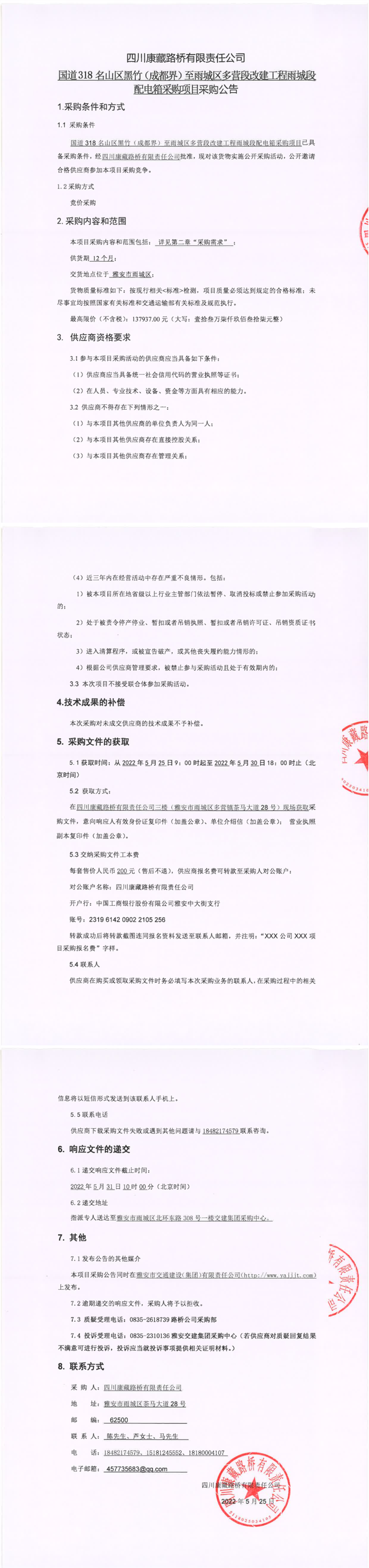 四川康藏路桥有限责任公司国道318名山区黑竹(成都界)至雨城区多营段改建工程雨城段配电箱采购项目采购公告