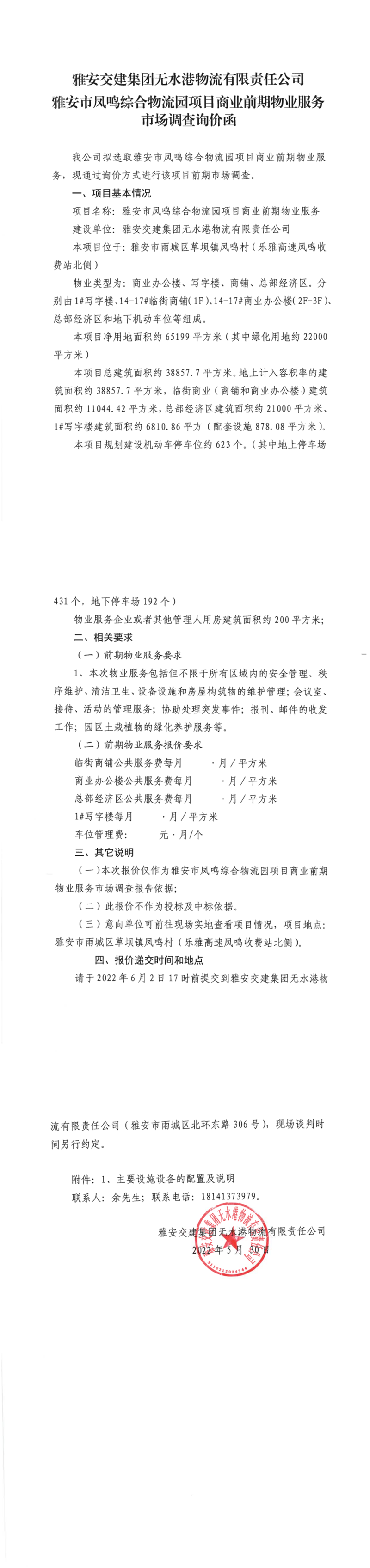 币游集团无水港物流有限责任公司雅安市凤鸣综合物流园项目商业前期物业服务市场调查询价函