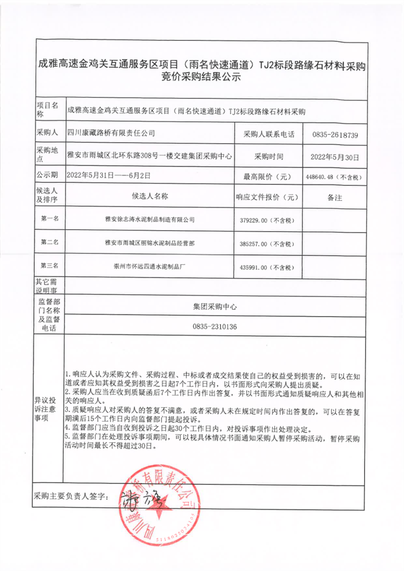 四川康藏路桥有限责任公司成雅高速金鸡关互通服务区项目(雨名快速通道)TJ2标段路缘石材料采购竞价采购结果公示